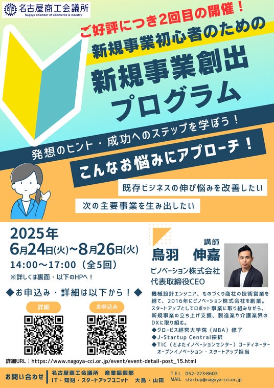 名古屋商工会議所は、受講者全員が「他の人にも勧めたい」と評価した「新規事業創出プログラム」の第2弾を開催いたします。今回も、J-Startup CENTRAL選定企業であり、製造業向けの協働ロボットソリューションなどを展開する「ピノベーション株式会社」と連携し、スタートアップの実践的なワークショップ形式で、事業アイデアの創出からビジネスモデル構築、発表までを伴走しながらサポートします。