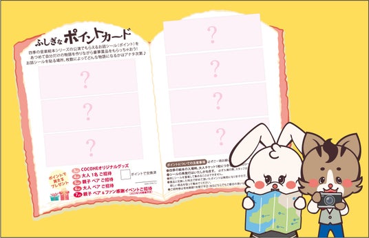 毎回異なる文章がシールに記載されており、ポイントを揃えていくと文章が出来上がっていきます。しかし、全7種のシールをどのような順番で貼るのかによって最後に出来上がる物語の印象が変わる不思議なポイントカードです。全7種類のシールは、年間を通して四季の音楽絵本シリーズの各公演毎に1種類ずつ配布され、貼付する順番によって5040通りのオリジナルストーリーが誕生します。COCOHEのコンサートがストーリー仕立ての音楽コンサートであることから、それを印象づける販促物として自分だけのオリジナルストーリーを作りながら、楽しんで音楽コンサートにリピートしてもらう事を狙い企画されました。