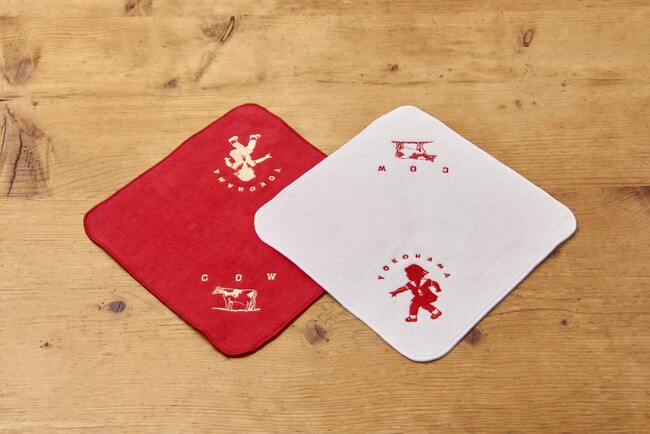 横浜を舞台とした童謡「赤い靴はいた女の子」をモチーフとした赤箱コラボのミニタオル。綿100%のタオル地で、吸湿性がいいので、スマートな汗ふきに。牛のロゴや赤い靴をはいた少女のシルエットは、細かく刺しゅうされているので、何度洗濯をしても色あせることはありません。