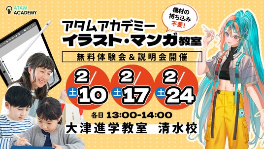 小中学生向けにオンラインイラスト・マンガ教室を運営している株式会社アタムは、この度、静岡県にて学習塾・プログラミング教室を運営する大津進学教室と連携し、アタムアカデミーのイラスト・マンガ教室体験会を開催いたします。