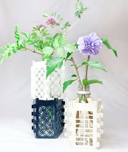 ■特徴:廃プラスチックを活用したフラワースタンドとペットボトルオープナー。東北芸術工科大学との共同開発。デザインのベースは学生が提案し、金型の設計から量産。