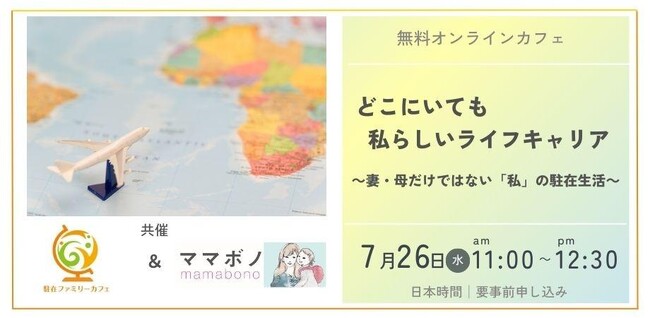 株式会社グローバルライフデザイン(代表取締役:飯沼 美智恵、本社:東京都大田区、以下「GLD」)が運営する駐在員家族向け海外生活情報・交流サイト「駐在ファミリーカフェ」は、認定NPO法人サービスグラント(代表理事:嵯峨 生馬、事業所:東京都渋谷区、以下「サービスグラント」)が提供するママたちのボランティアプロジェクト「ママボノ」と共同で、「どこにいても私らしいライフキャリア~妻・母だけではない『私』の駐在生活~」をテーマにしたトークイベントを、2023年7月26日にオンライン開催します。