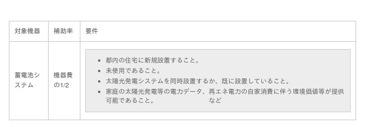 東京都では、家庭における太陽光発電による電気の自家消費の増大及び非常時の防災力向上等を目的として、蓄電池システムを設置した住宅に、その費用の一部を補助します。
