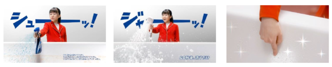 新CMでは、「こすらず汚れが落とせることに半信半疑」というお客様へ、浴槽をこすらずにキレイにできる手軽さと爽快さを「シューッ!ジャーッ!キュッ!」の音と動作で表現しております。