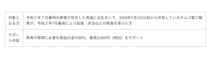 「令和2年7月豪雨災害サポート」では今回の豪雨により水没・転倒したキムコ製二輪車の修理に必要な部品代の一部について最大3,000円(税別)をサポート。
