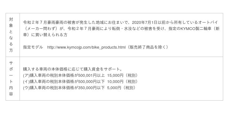 また、今回の豪雨による水没や転倒などにより、使用不可能になった自動二輪車(他社製を含む)から、対象のキムコ製二輪車の新車へ買い替えをされる方に、5,000円から15,000円(税別)の購入費用をサポートします。