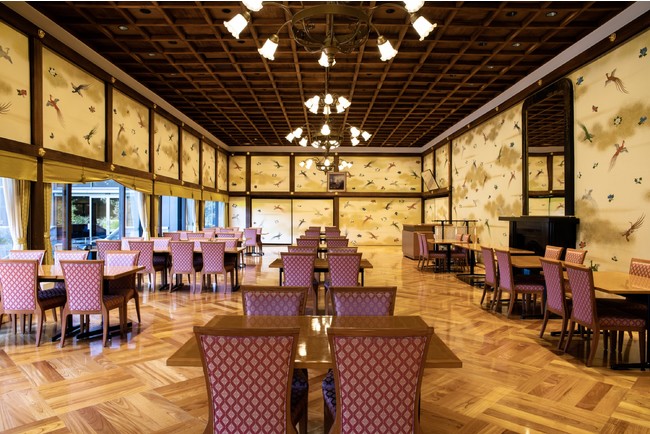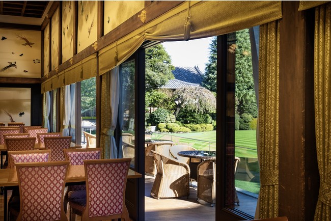 四季折々の花や緑が季節を織りなす庭園に面した開放的なラウンジ。壁一面に金鶏が舞い、部屋の中央には堂々とした漆塗りのマントルピース。赤坂仮皇居御会食所をそのままに、明治時代の面影を残す格天井など歴史あるインテリアが上質な時間を紡ぎます。