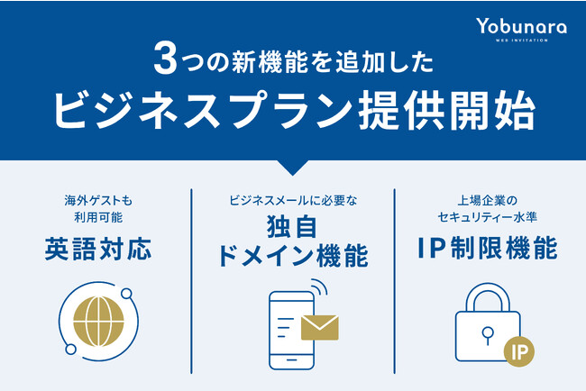 Yobunaraでは、昨年のリニューアル後、ビジネスユーザーのご利用増加に伴い、お客様より「海外の来賓用に英語版が欲しい」「自社ブランドのドメインで招待メールを配信したい」「会社のセキュリティ水準に合わせアクセス制限をしたい」等、多くのご要望をいただくようになりました。
