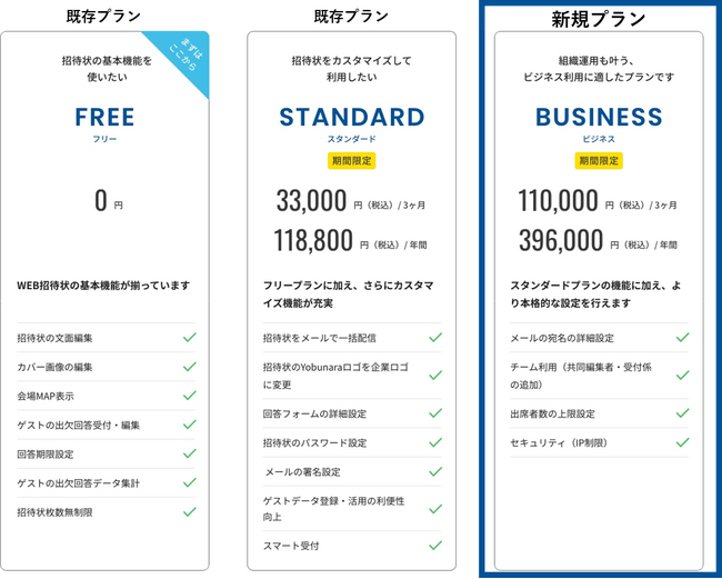 これまでの料金およびプランに含まれる機能を見直し、既存の「フリープラン」「スタンダードプラン」に加え、「ビジネスプラン」という新プランの提供を12月14日(木)から開始します。