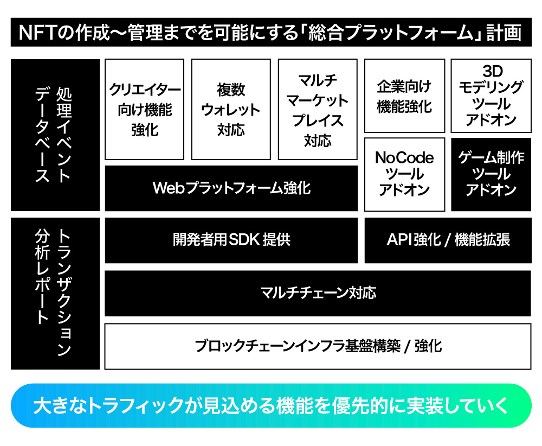 今後は、複数のマーケットプレイスへの出品を可能にする「マルチマーケットプレイス対応」と「マルチチェーン化」、英語対応により海外ユーザーを獲してまいります。また、データの管理や分析などインフラ機能も組み込み、NFTの開発から管理までを可能にする「総合プラットフォーム」を目指すことで企業として成長してまいります。