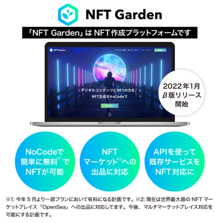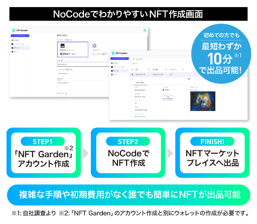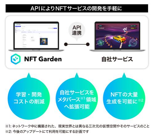 Connectiv株式会社の提供する「NFT Garden」では、NFTの作成を無料で始められ、NoCode(※1)でNFTを作成でき、NFTマーケットプレイスへの出品までを簡単なステップで実施できるようにしています。「NFT Garden」は、開発者向けにもサービスを提供しております。これまで、NFTを自社サービスなどに組み込む場合、企業の開発者にはブロックチェーンに関連するプログラミング言語の学習コストが発生するため、開発の手間をかけて作りこむことを余儀なくされていました。しかし、「NFT Garden」のAPI(※2)を使うことで、それらの学習コストなく自社サービスへNFTの仕組みを導入することができます。また、将来的には、NFTをAPI経由で大量に生成できるようになる予定です。