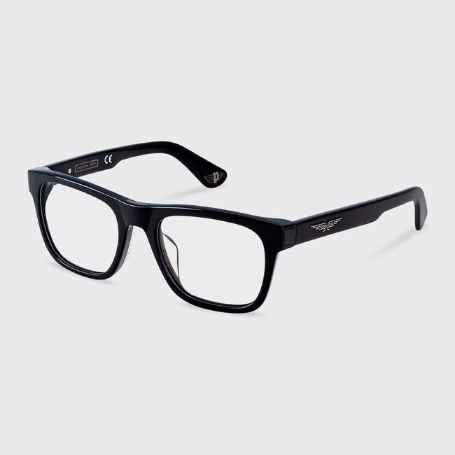 光沢のあるブラックアセテートのフレームで、分厚いスクエアフォルムの印象的なフロントと、90年代を象徴するPOLICEのイーグルロゴをあしらったテンプルが特徴です。