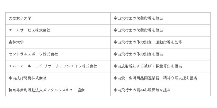 有人宇宙システム株式会社(本社:東京都千代田区、代表取締役社長:古藤俊一、以下「JAMSS」)は、国立研究開発法人宇宙航空研究開発機構(以下「JAXA」)からの契約に基づき、国内7企業・大学からなるビジネスパートナーとともに、星出宇宙飛行士が身体・精神的に最高のコンディションでこれから始まるミッションへ取り組めるよう健康管理運用に取り組みます。また、ISSより帰還する野口宇宙飛行士のリハビリテーションを始め、日本人宇宙飛行士の地上での活動を支える健康管理運用を行います。