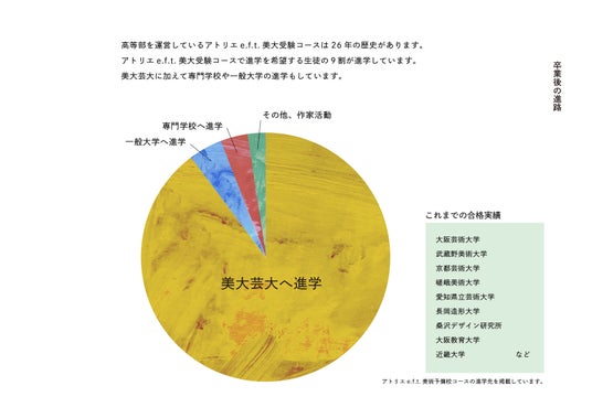 アトリエ e.f.t. 高等部は、偏差値やテスト、成績といった定量評価を排除し、生徒同士を過度に競わせることなく、独自の教育メソッドにより高い進学率を維持しています(毎年合格率98%以上)。