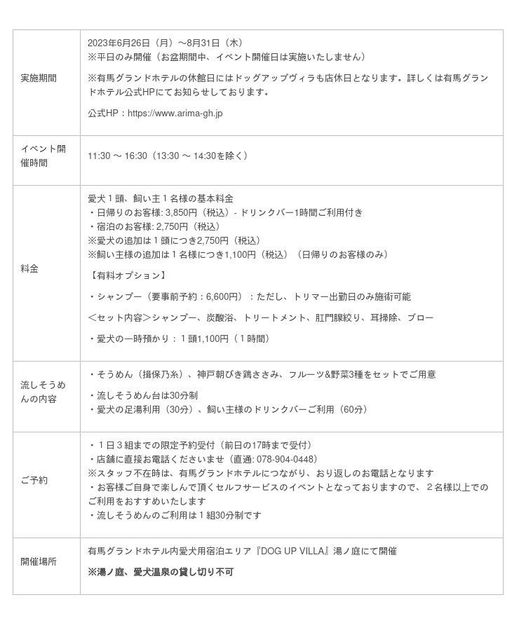 株式会社中の坊(兵庫県神戸市北区有馬町1304-1 代表取締役 梶木 実)は、有馬グランドホテル内愛犬専用エリア『DOG UP VILLA』にて、2023年6月26日~8月31日の期間で「愛犬流しそうめん」を開催いたします。