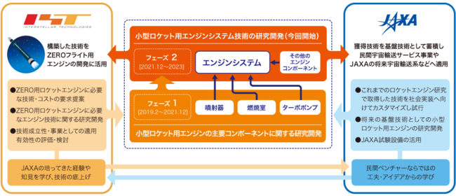 JAXAとISTは、2019年2月よりJ-SPARCの共創活動(フェーズ1)を通じて、小型ロケットエンジンの主要コンポーネントである噴射器、燃焼室、ターボポンプを対象にした研究開発に取り組んできました。この共創活動ではJAXA角田宇宙センターの試験設備を活用し、JAXAはこれまでのロケットエンジン研究で取得した技術の社会実装に向けた試行と将来の基盤技術としての小型ロケット用エンジン技術の研究開発を、ISTは現在開発中の超小型人工衛星打上げロケット「ZERO」(以下「ZERO」)に適用するロケットエンジンを想定した仕様の設定や技術の研究開発を、それぞれ実施しました。*2