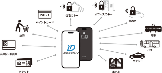 PaylessGateの提供するSpeeIDyは、一般的なスマートフォンで使用可能なBluetoothを用いて、PaylessGateが保有する世界初の技術(*1)である「超高精度の位置測定技術」及び「スーパーコンピューターにも破られないセキュリティの高い認証技術」を組み合わせることで、ETCのようにスマートフォンを持ち運ぶだけでハンズフリー・非接触の認証・決済を可能とする認証・決済プラットフォームです。SpeeIDyアプリには、イベント受付、ポイント・決済、自動改札、スマートキーなど既存の様々な認証・決済サービスとの接続が可能であり、従来分散していたリアルにおけるデジタル認証を統合するプラットフォームとして機能します。