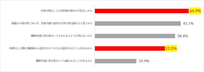 2017年のJAFによるアンケート調査結果(※)によると、「ドライバーが一時停止しない(できない)と考えられる理由」の1位(44.9%)は、「自車が停止しても対向車が停止せず危ないから」。4位(33.5%)にも「一時停止した際に後続車から追突されそうになる(追突されたことがある)から」という回答が挙がっており、「止まりたくても、周りのクルマが止まらないから危なくて止まれない」と考えているドライバーが数多くいることが読み取れます。