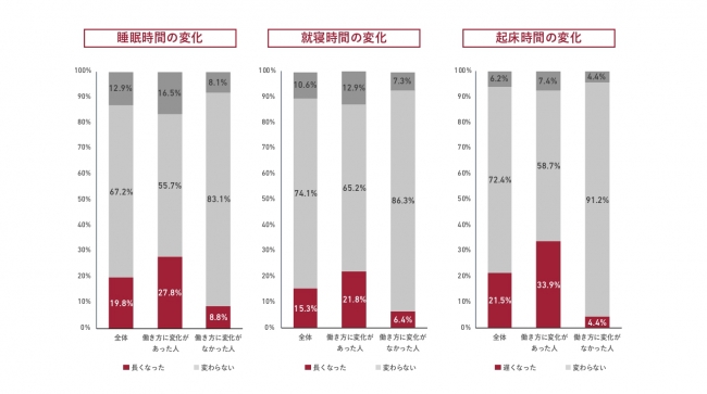 その結果、働き方に変化があった人の多くで、睡眠の質は下がり、起床・就寝それぞれの時間が後ろ倒しの夜型に移行していることがわかりました。
