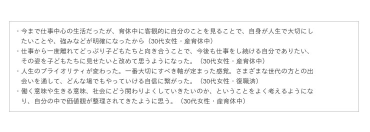 育休期間の経験は仕事に活かせるだけでなく、「より自分らしい生き方、働き方につながった」と8割の女性が考えていました。具体的には1.自分の特性や強みへのより深い理解、2.仕事に対するスタンスの明確化、3.人生における優先順位や価値観の変化、4.社会、地域への関わり方の変化、といった回答が挙げられました。