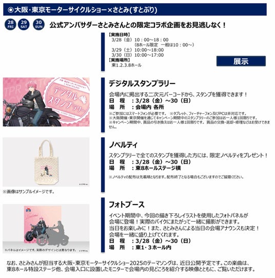 今回、大阪・東京モーターサイクルショーの連動強化とともに、若年層へのアプローチを積極的に図るため、大人気2.5次元アイドルグループ「すとぷり」のメンバーであるさとみさんを公式アンバサダーに任命いたしました。「大阪・東京モーターサイクルショー×さとみ(すとぷり)」限定コラボ企画として、会場を楽しみながら周遊するデジタルスタンプラリーや、バイクにまたがって描き下ろしイラストのパネルと撮影ができるフォトブースなどを展開し、これまでバイクに触れる機会がなかった方々にも今回のコラボをきっかけにバイクの魅力を肌で感じていただき、次世代のモーターサイクルファンづくりにつなげていきます。