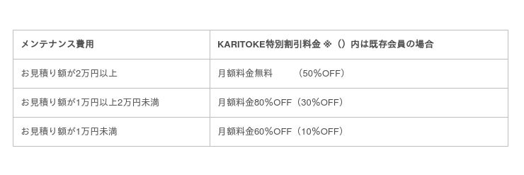 - 「KARITOKEメンテナンスの紹介」とご記載いただくと、メンテナンス費用に特別割引料金が適用されます。