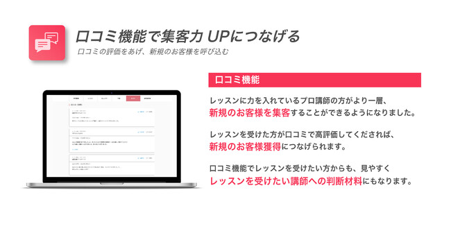 そのため、レッスンに力を入れているプロ講師の方は、より一層新規のお客様を集客することができるようになりました。