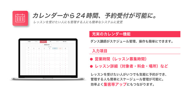 NEW LODではダンス講師が、営業時間(レッスン募集時間)・レッスン詳細(対象者・料金・場所)など必要な項目を入力し、投稿することで、いつでもお客様がカレンダーから空きのあるスケジュールを一目でわかるようになりました。