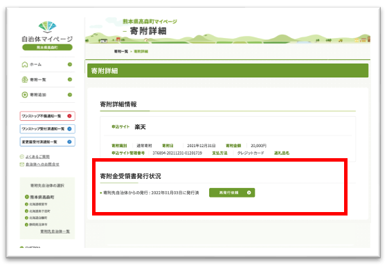 【3】寄附金受領証明書の再発行要請をオンラインで申請可能