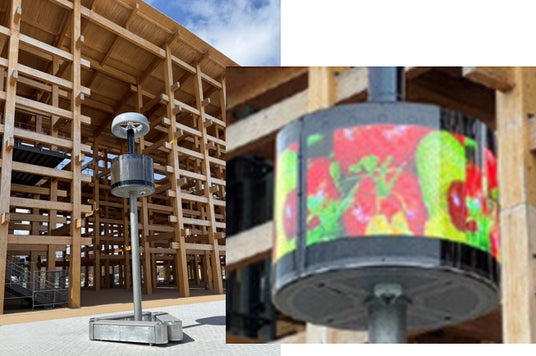 電力館 可能性のタマゴたち パビリオン建屋前 世界最軽量級の曲面LEDサイネージ FDSS