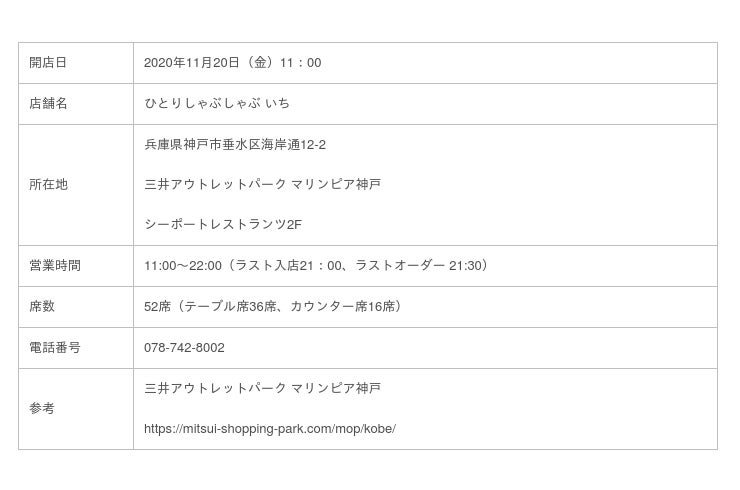 株式会社ツースリー(本社:東京都新宿区、代表取締役:中井 勇気)が運営する、ひとりしゃぶしゃぶ いち は2020年11月20日(金)に三井アウトレットパーク マリンピア神戸に新店をオープン致します。