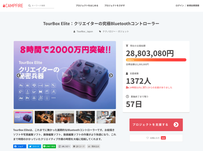 2021年11月、アメリカのクラウドファンディングにおいて『TourBox Elite』のプロジェクトを実施。支援額は約$710,000(約8,157万円)、バッカー(支援者)は2827人を達成しました。『TourBox』シリーズのクラウドファンディングにおいて最高記録を出しました。