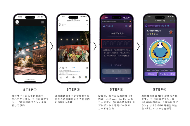 投稿後、LAND KNOTからお客様(予約者)へCamp to Earnのコードディ(8桁の英数字)をプレゼント!専用ページでコードを入力