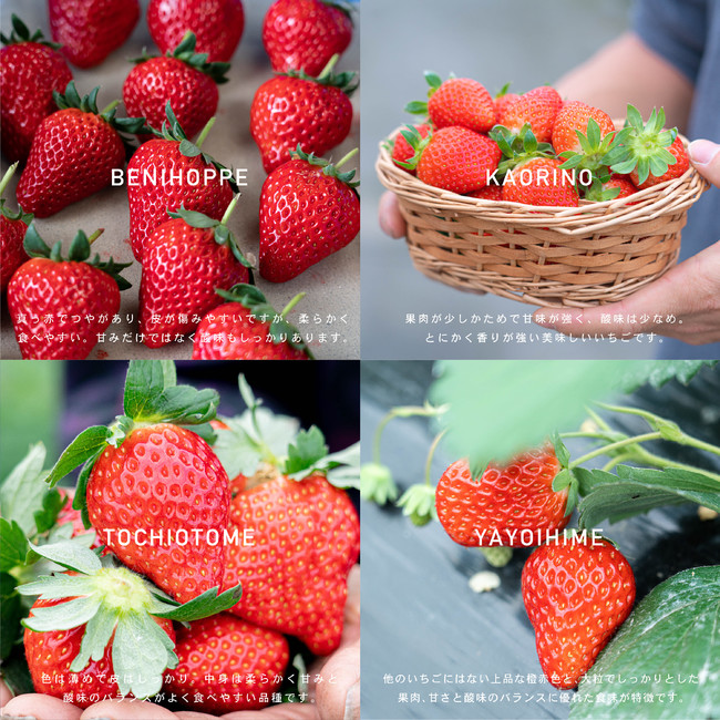 [紅ほっぺ]、[とちおとめ]、[かおり野]、[やよいひめ]の中から、いちごマイスターがおすすめ品種をチョイス!