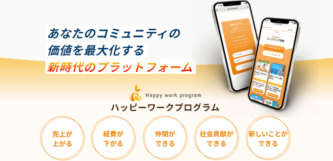 2020年3月のリリースからわずか1年9ヶ月で総ユーザー数500万人を突破したコミュニティ向けのプラットフォームです。「ハッピーワークプログラム」はコミュニティの活性化を行う事のできる機能を持ち、コミュニティの売り上げの改善、コミュニティメンバー満足度の拡充、コミュニティ価値向上を行える仕組みです。