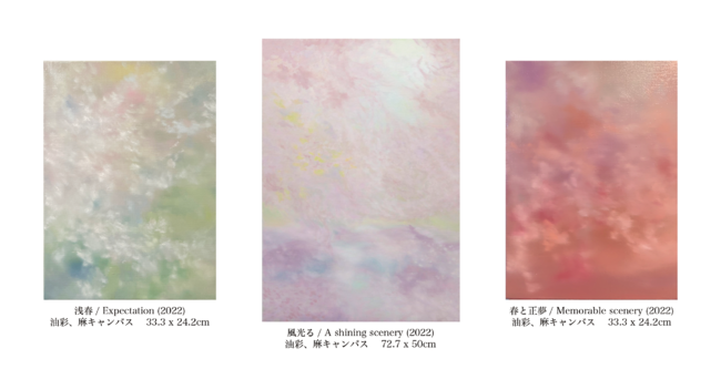 作家自身によれば、この色調の変化は、鑑賞者が「桜」に対して抱く個別具体の思い出からの影響、そして「桜」というモチーフが要求する多色性への応答が引き起こしたものです。たしかに原則一色のみで仕上げていた青のシリーズと比べると、色幅も広がり、色同士の関係性も複雑化しています。「青」の表現するものが深淵で揺らぐ微かな光だとしたら、「桜」は意識的なコントロールを逸脱した、いわば乱反射する光だといえるでしょう。多色がもたらす偶発性を受け入れ、いかにそれに身を委ねるかを考えながら筆を進めた結果、今回の作品には予期せぬ散逸性や軽やかさが生まれました。
