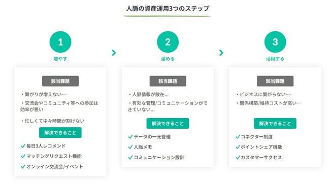 "人脈の資産運用を全方位的に支援する”という新たなサービスコンセプトを掲げ、より多くのビジネスパーソンの課題解決や人脈形成の支援を目指します。