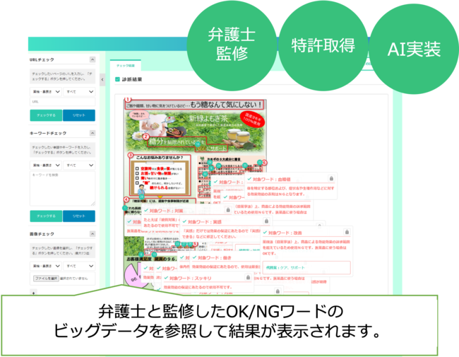 AIが自動的に判別し、Webサイト上に病名が含まれていた場合NG項目として検出することができるようになりました。