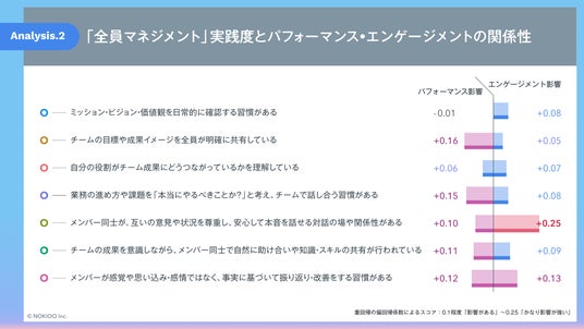 本調査では、職場における日常的なマネジメント行動─たとえば目標の共有や、役割の明確化、相互の支援や対話など─について幅広く質問を設計。そのうえで、NOKIOOが提唱する「全員マネジメント」の行動体系に照らし合わせ、該当する行動の実践度をスコア化し、パフォーマンスやエンゲージメントとの相関を分析しました。