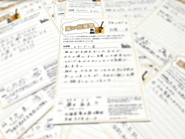 私達はニーゴ・リユースの出張買取サービスをご利用のお客様を通じて、貴重な商品にまつわる思い出を拝聴する機会を沢山いただいてきました。これらの素敵な思い出を査定士との会話だけに留めるのではなく、思い出を手紙という形で共有していただくことで、お客様の想いにより寄り添っていくことが出来るのではないかと考えました。