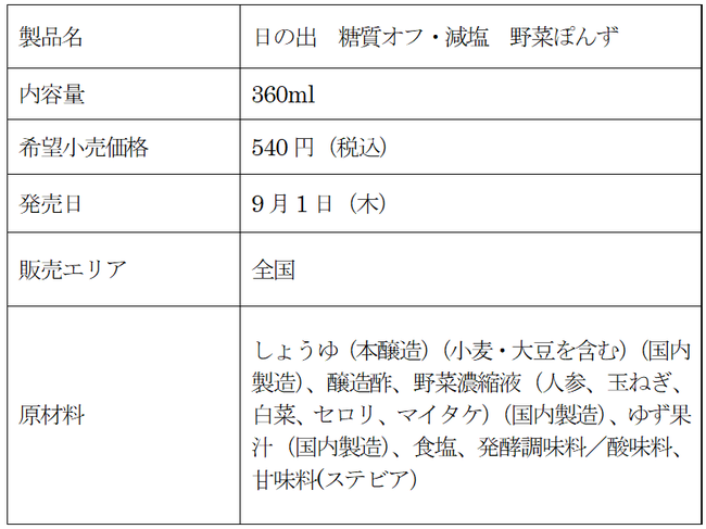 健康意識の高まりから、糖質オフや減塩への関心は年々高まりを見せ、普段の食生活から調味料にも配慮される方が増えています。ぽん酢は使用用途が年々広がり、かける、つける用途だけでなく、普段の料理の調味料として使用する機会が増えています。その中で、料理酒カテゴリーNo.1ブランド※「日の出」が、糖質ゼロ・オフシリーズの開発で培った技術を活かし、国産野菜の旨味を活かした「野菜ぽんず」を開発しました。