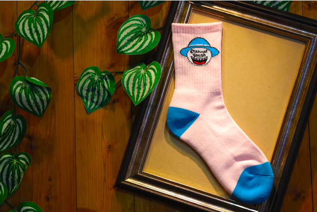 ショップ名でもある「決して老いない」をテーマにしたアイテムの1つで、私たちは年齢や時代に左右されず、永遠に若々しくありたいと考えています。このソックスを履いていると、自然とポジティブな気持ちになれるはず!