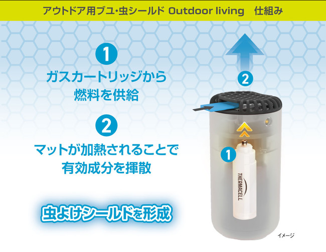 アウトドア用ブユ・虫シールドは米国Thermacell(サーマセル)社の開発した屋外用途の空間虫よけです。Thermacell社の虫よけ製品は20年以上にわたり販売されており、世界中の31の地域で販売・使用されています。