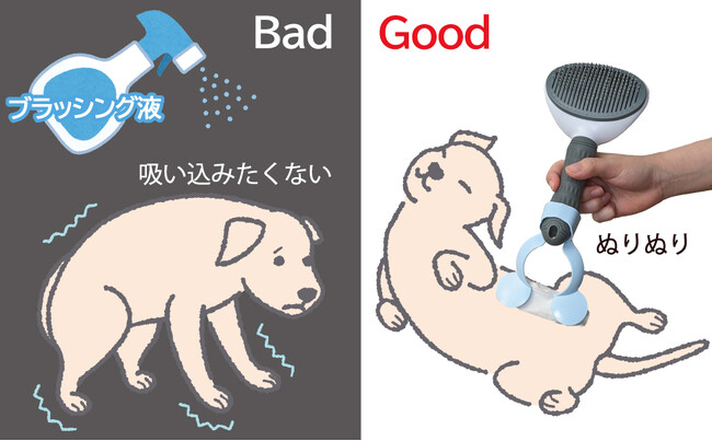 本商品を使うことで、ブラシと保湿液の2つを片手で使い分けできます。道具を持ち替える動作が必要なく、短時間で作業できるため、人間の作業のストレスを軽減するだけでなく、道具を怖がるペットのストレス対策にもなります。