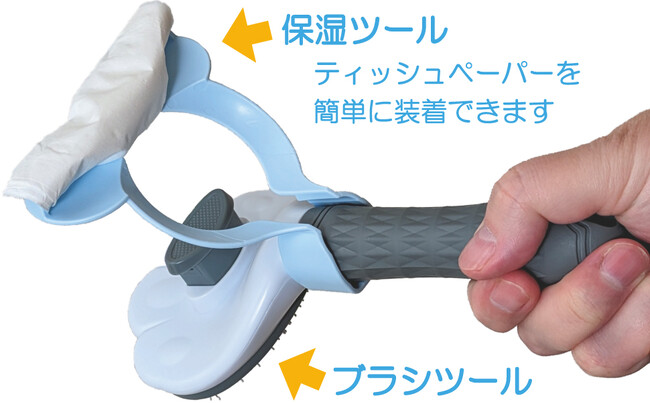 プロ向けの単体商品「ダブルトリマー 多目的ハンド」は、市販のティッシュペーパーを簡単に取り付けることができ、保湿ツールとして使用できます。これを中指に掛けて、様々なブラシを持てば、片手二刀流で作業できます。これまで使い慣れたブラシが使えるので、プロのペットサロンでも使用できます。詳しくは、下記の動画をご覧ください。