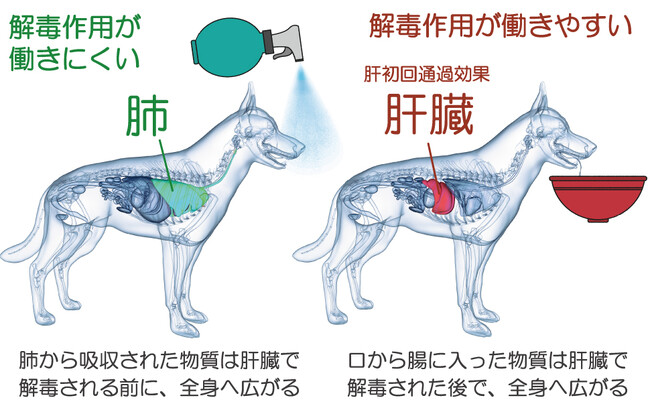 犬や猫の体は、口から飲み込んで腸に入った物質を、いったん、解毒器官である肝臓を通過させることで、なるべく解毒(分解・代謝)してから、全身に循環させます。これを「肝初回通過効果」といいます。これに対し、ペットがスプレーを鼻から吸い込んで、肺で吸収された物質は、最初に肝臓を通過せずに、すぐ全身に循環してしまいます。このため、毒性が強く出る可能性があり、スプレーには注意が必要です。