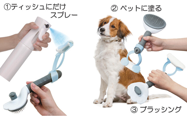 このツールを使うことで、毛のもつれたところにブラッシング液を塗りながら、効率よくブラッシングすることができます。ブラッシング液を直接ペットにスプレーするのではなく、保湿ツールにスプレーしてから塗ります。このため、スプレーされることを嫌がるペットにも塗りやすくなります。また、スプレーの飛沫がペットの肺に入らないように安全に塗布できます。