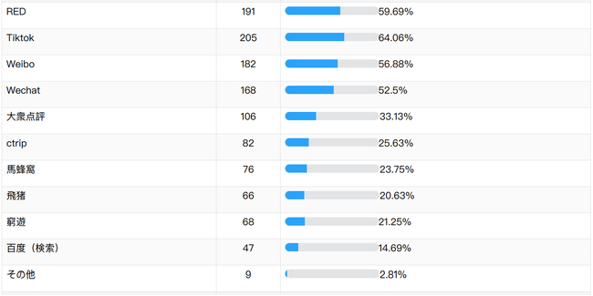 RED(小紅書)が約80%でNo.1プラットフォームに。観光分野でもWeibo(ウェイボ/微博)は、3番手メディアに陥落