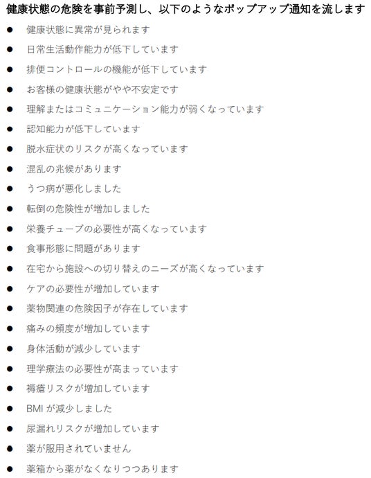 あらゆる健康状態の危険を事前予測し、ベテランの職員しか気づけないようなリスクも通知される