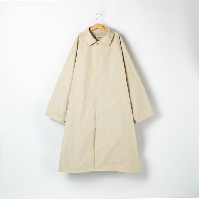 また、ベーシックなアイテムこそ9割生地で決まるという信念のもと、イギリスの空軍のジャケットにも使用されている最高品質で世界三大綿のエジプトのギザ綿を使用し、“防水・防風・耐熱”と高い耐久性を持つ機能性抜群な生地でコートを製作。今回、シンプルなアイテムが多いTARROWと、相性の良いコートとして、通年人気のステンカラーコートを採用しました。
